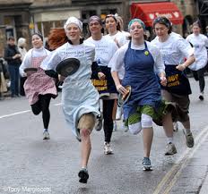 Some parts of Britain celebrate the day with pancake races (click here for a video). The oldest and most famous is held at Olney in Buckinghamshire. The race is run over 415 yards by women aged sixteen or older. They must flip their pancake in the frying pan at least three times during the race. The winner receives a kiss from the Pancake Bell Ringer – church bells were traditionally rung to remind parishioners to come to confession – and a prayer book from the vicar.